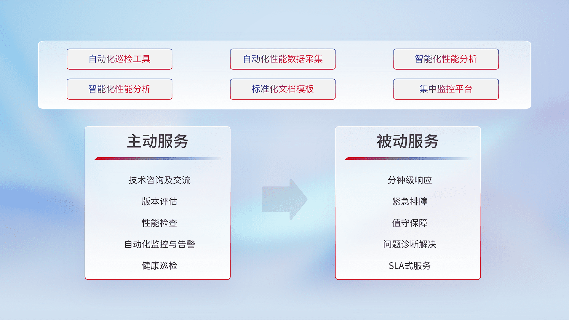 智能化工具和标准化文档,,,,保障服务质量,,,,提供主动服务(包含技术咨询、、、版本评估、、、性能检查、、、自动化监控与告警、、健康巡检)和被动服务包含(分钟级响应、、紧急排障、、、、值守保障、、、、问题诊断解决、、、、SLA服务)。。