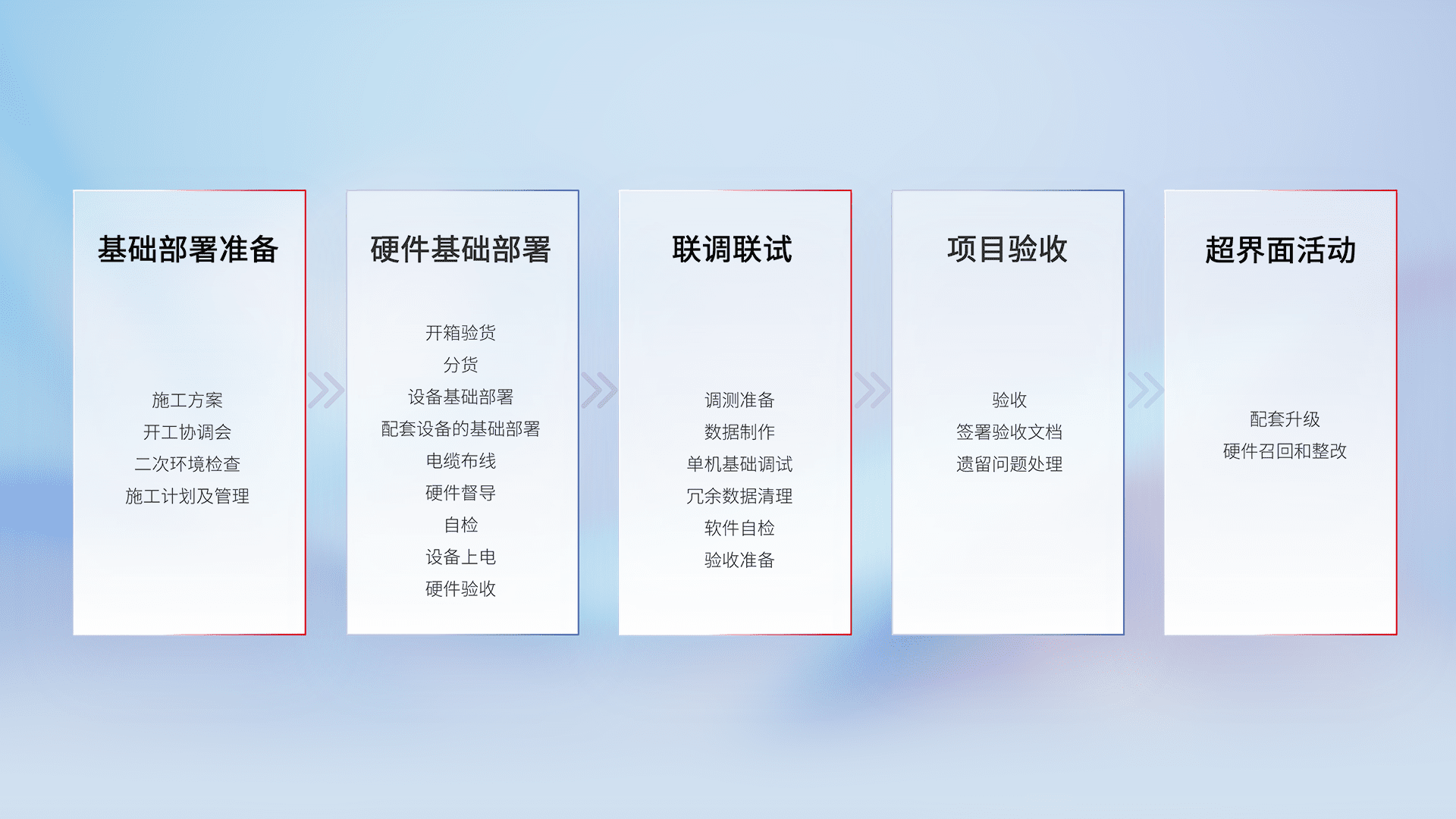 从基础部署准备、、硬件基础部署、、、、联调联试、、、项目验收、、、越界面活动的全过程可追溯,,保证施工质量和进度。。。。